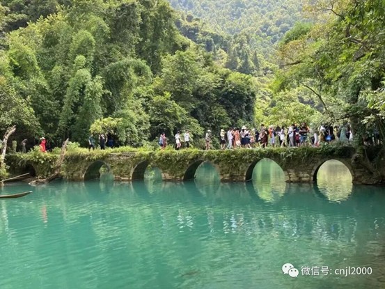 瀑布不远处,便是小七孔古桥。小七孔古桥奇、幽、俊、秀、古、野,也是一道美丽的风景线。古桥小巧玲珑,古桥下方,碧绿的树倒映在碧绿的水中,原始古朴的民族风情与原始性强的喀斯特森林完美地结合在一起,充分显示了大自然的奇迹。我们看了,只觉心旷神怡,恍若置身仙境。
