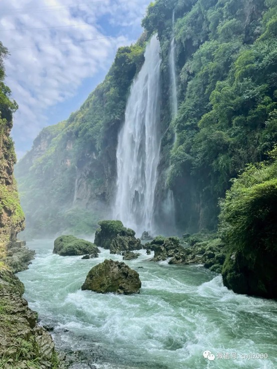 徐霞客用“神竦”描述黄果树瀑布,绝非夸张。在黄果树瀑布,我们看到,奔腾的河水自70多米高的悬崖绝壁上飞流直泻而下,发出震天巨响,如千人击鼓,万马奔腾,声似雷鸣,远震数里之外,我们置身其中,从水帘洞内观看大瀑布,那场景令人惊心动魄。